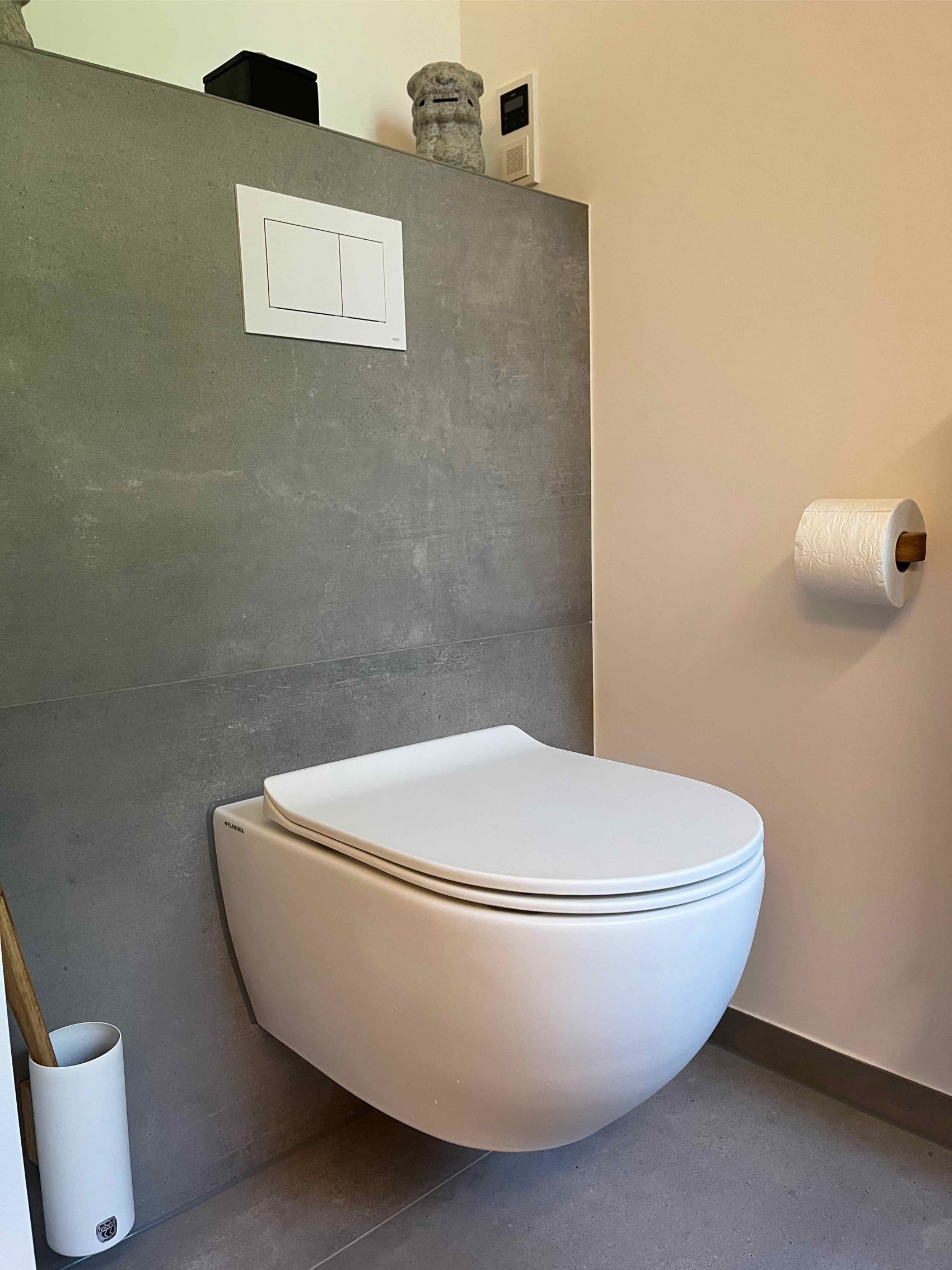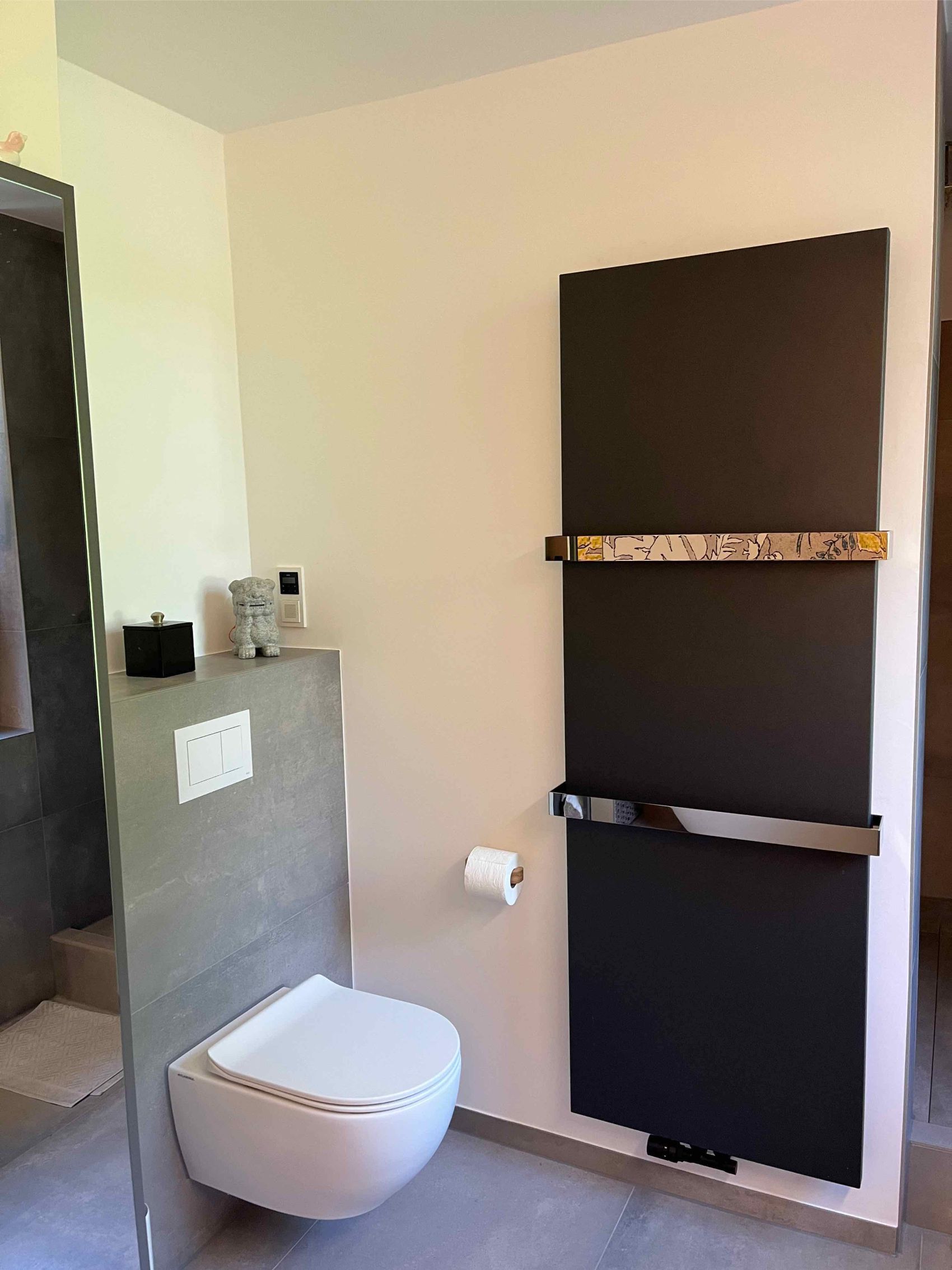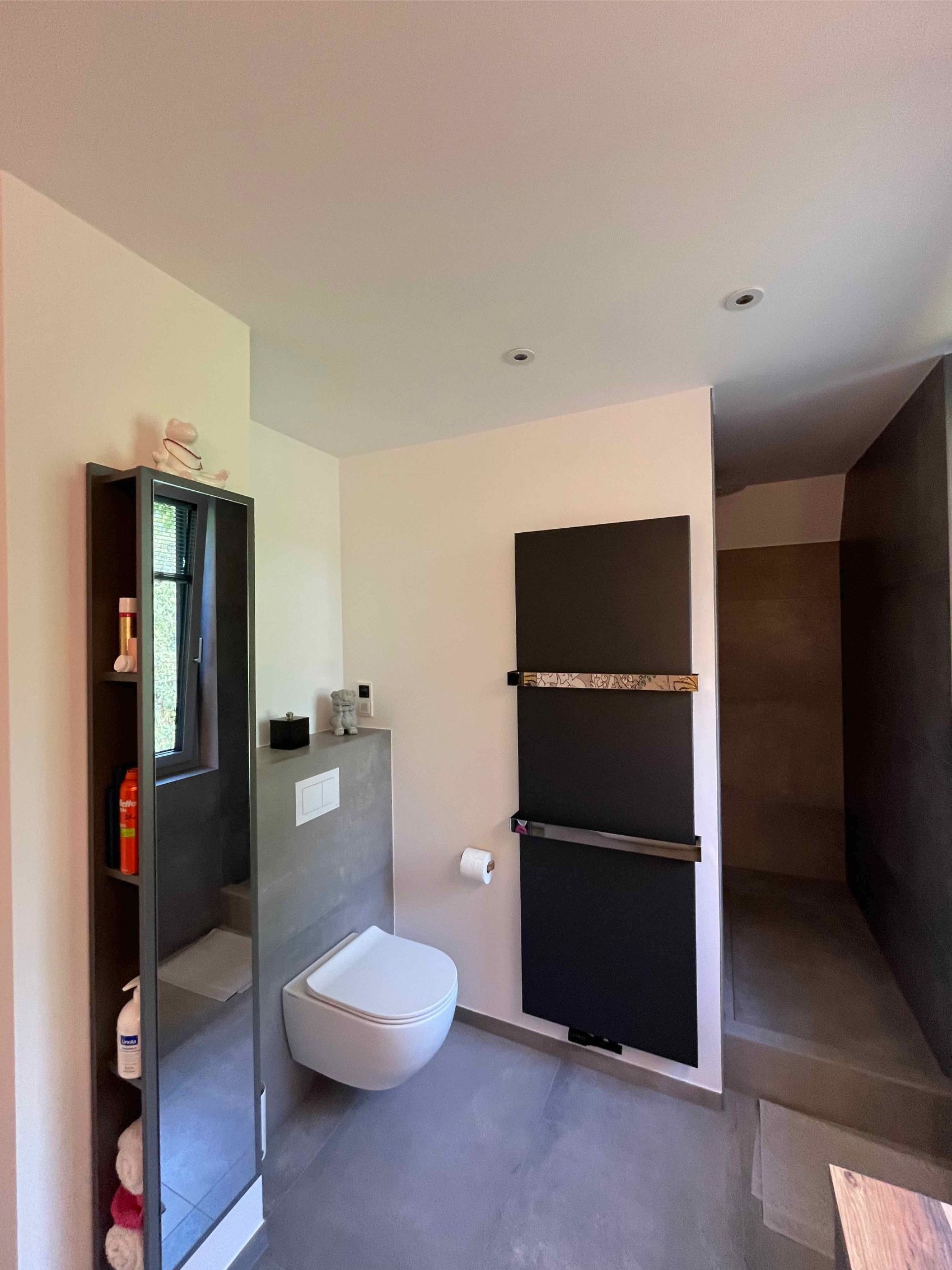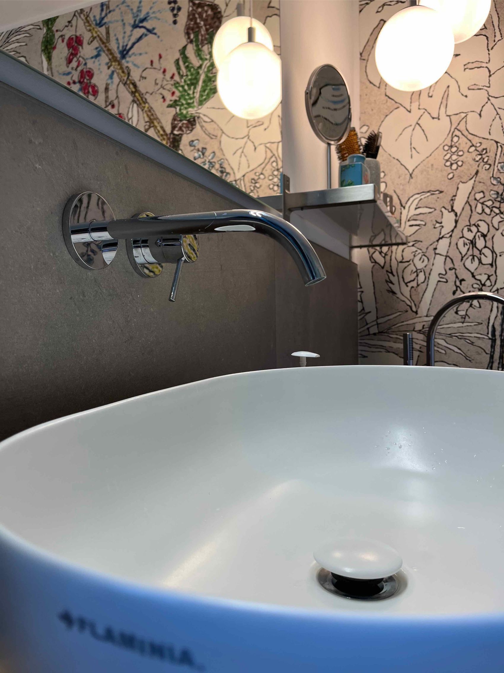 Auch der Waschplatz und der Duschbereich wurden mit viel Liebe zum Detail und Produkten renommierter Marken gestaltet. Ein Laguna-Waschtischunterschrank mit warmer Holzfront trägt ein modernes Aufsatzbecken von Flaminia, kombiniert mit einer puristischen Wandarmatur von Dornbracht. Ein großer, beleuchteter Spiegel sorgt für optimale Lichtverhältnisse. Das durchdachte Lichtkonzept mit Spots und indirekter Beleuchtung setzt die hochwertigen Materialien und das einzigartige Wanddesign perfekt in Szene. Diese Sanierung zeigt eindrucksvoll, wie durch Fachkompetenz und exklusive Markenprodukte ein Badezimmer mit individuellem Charakter und höchstem Komfort im Raum Hude realisiert werden kann.