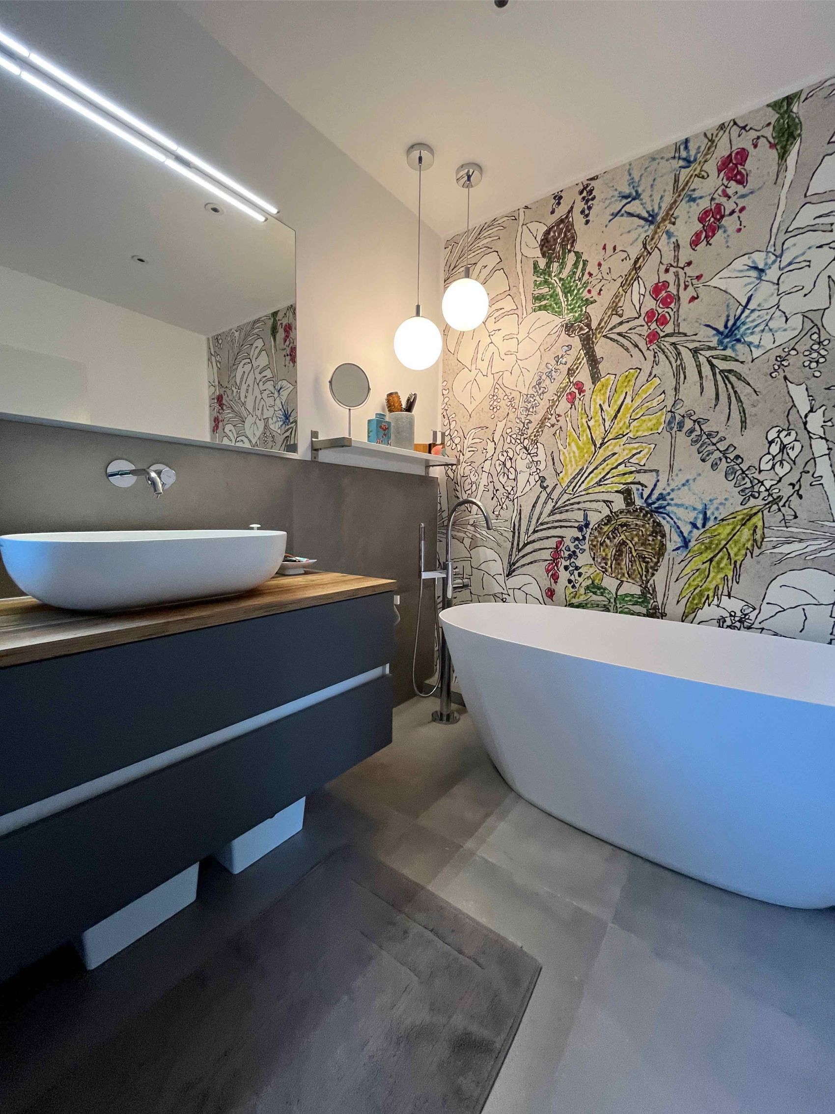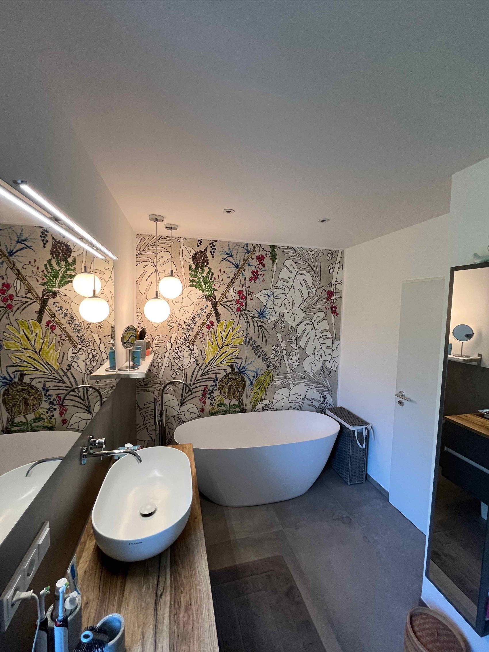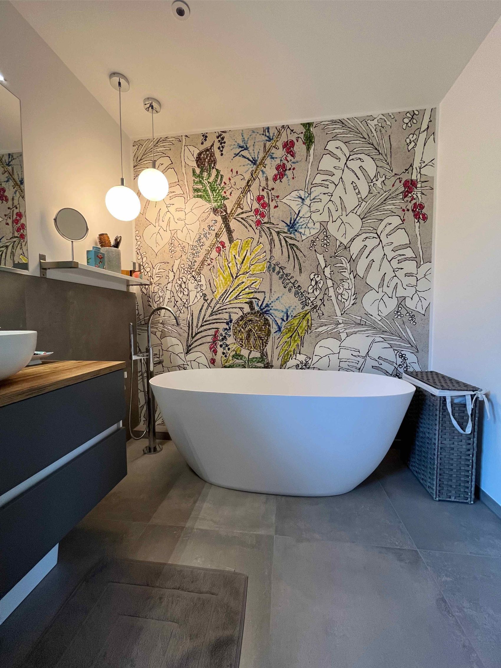 In einem Einfamilienhaus im Raum Hude wurde das Badezimmer im Obergeschoss im Rahmen einer Komplettsanierung in eine luxuriöse Wellness-Oase verwandelt. Das architektonische Highlight des Raumes ist zweifellos die großzügige, freistehende Badewanne von Repabad, die vor einer kunstvoll gestalteten Akzentwand platziert wurde. Diese Wand ist mit einer hochwertigen Design-Tapete von Wall&Deco versehen, deren farbenfrohes, botanisches Motiv einen lebendigen Kontrast zu den großformatigen, dunklen Bodenfliesen bildet. Eine elegante, bodenstehende Wannenarmatur von Dornbracht komplettiert das exklusive Arrangement und lädt zu entspannten Bädern unter den stilvollen Pendelleuchten ein.