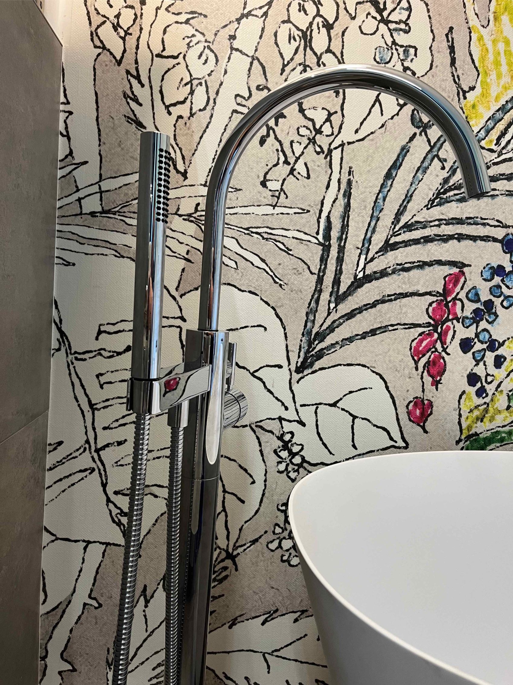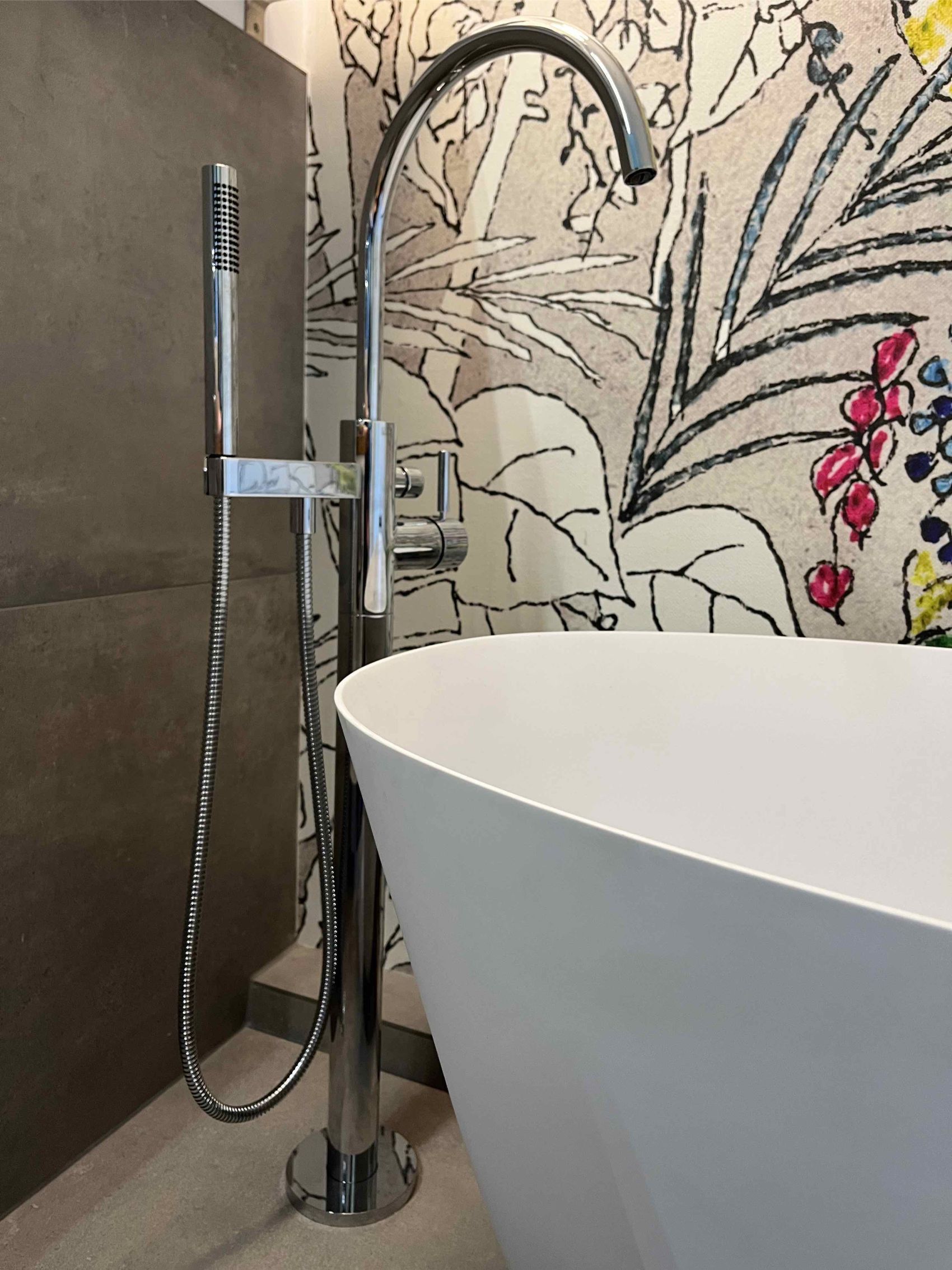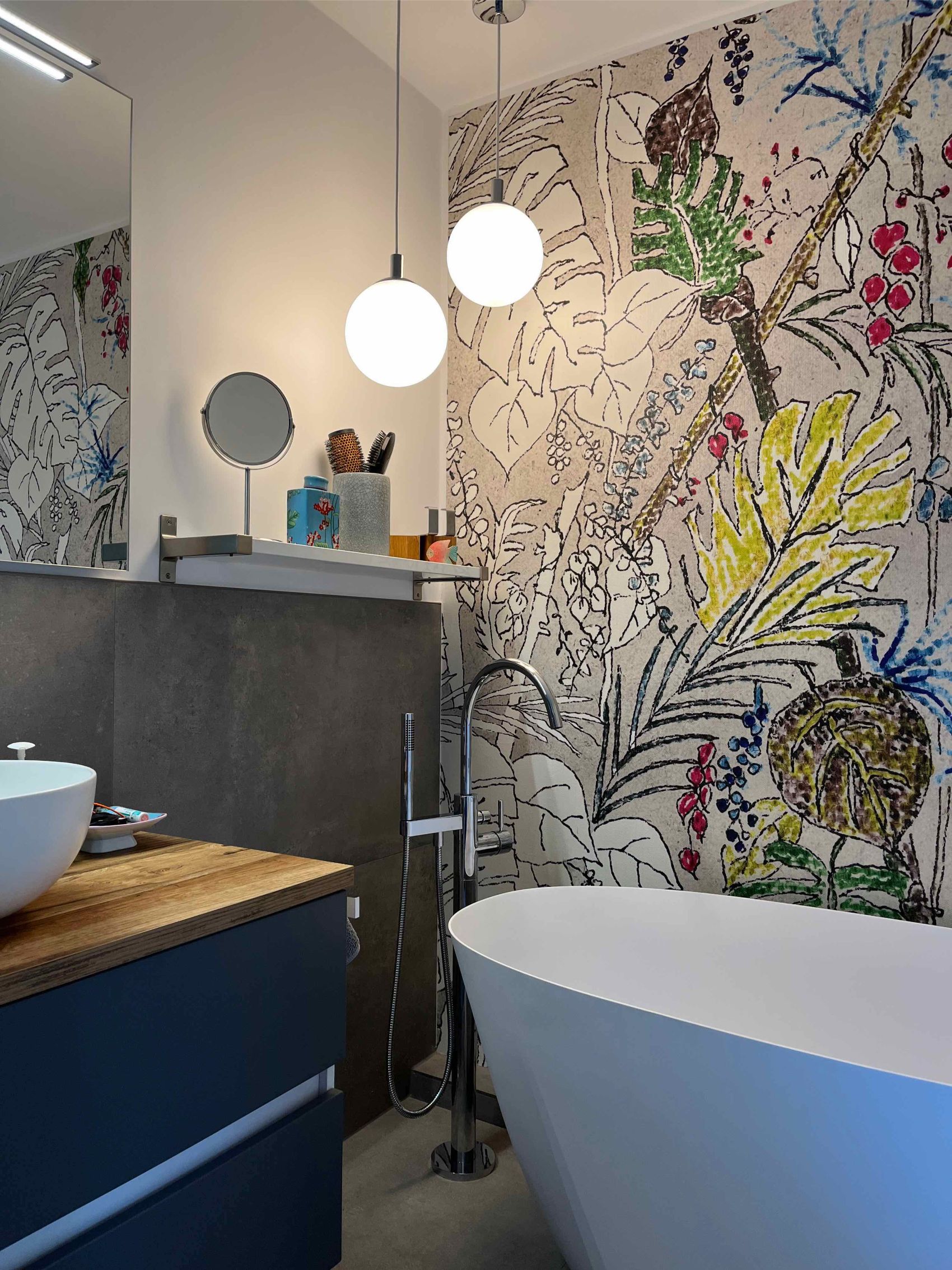 In einem Einfamilienhaus im Raum Hude wurde das Badezimmer im Obergeschoss im Rahmen einer Komplettsanierung in eine luxuriöse Wellness-Oase verwandelt. Das architektonische Highlight des Raumes ist zweifellos die großzügige, freistehende Badewanne von Repabad, die vor einer kunstvoll gestalteten Akzentwand platziert wurde. Diese Wand ist mit einer hochwertigen Design-Tapete von Wall&Deco versehen, deren farbenfrohes, botanisches Motiv einen lebendigen Kontrast zu den großformatigen, dunklen Bodenfliesen bildet. Eine elegante, bodenstehende Wannenarmatur von Dornbracht komplettiert das exklusive Arrangement und lädt zu entspannten Bädern unter den stilvollen Pendelleuchten ein.